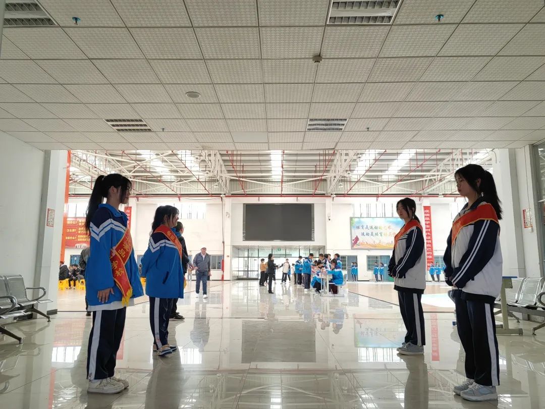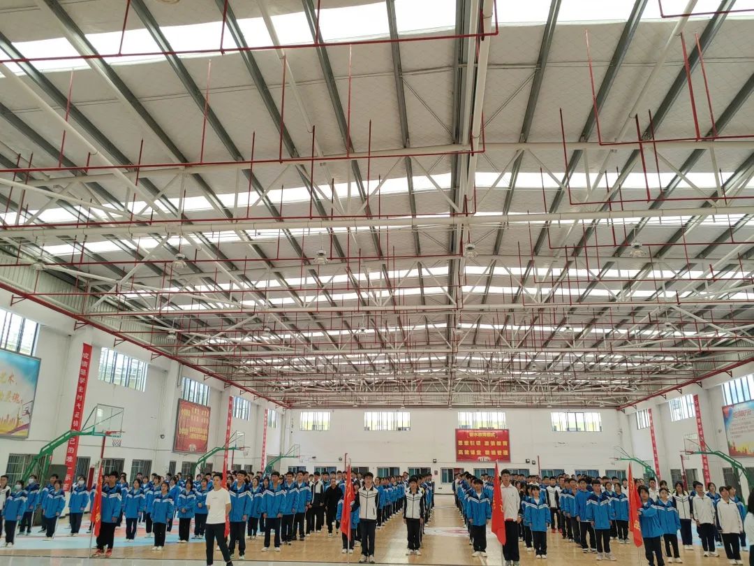 全体师生在篮球馆庄严肃立